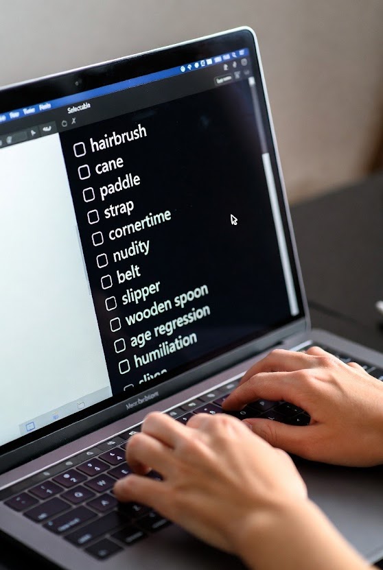 As my heart pounded in my throat, a frantic rhythm that echoed in my ears like a guilty verdict, sweat beading at the small of my back under my blouse, I navigated to the booking page – selecting “Domestic Discipline,” my finger hovering over some hard and soft limits.
