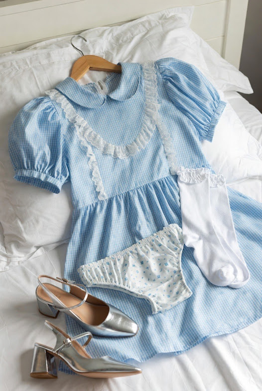 First up: this sickeningly adorable baby blue gingham dress with white lace accents and puffy short sleeves. Like, straight out of some vintage doll catalog but in adult sizing. It’s so frilly, so innocent—it makes my stomach twist just looking at the preview pic. Next, these delicate white nylon socks with ruffles around the cuffs. Ruffles! And then, shiny silver Mary Janes in my exact size, the kind little girls wear to tea parties or whatever. But the kicker? Full-bottom white cotton panties with these cutesy cartoon prints in baby blue scattered all over them. Hearts or teddy bears or something equally mortifying. I can already feel the soft fabric against my skin, how it’d bunch up under that dress, making me feel so small, so exposed in the most humiliating way.