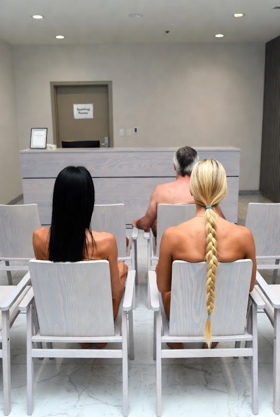 Stepping out of that locker room into the reception area feels like walking into a sauna—warm, almost too warm, the heat cranked up just enough to make your bare skin prickle without turning you into a sweaty mess. Everyone’s naked here, after all, no clothes to hide behind, just vulnerable flesh waiting for whatever comes next. I clutch my gift bag a little tighter, the one stuffed with that humiliating baby blue getup, and scan the room for a spot. There they are—the three from the lockers: the salt-and-pepper daddy type, looking all stoic with his caged cock bobbing awkwardly as he sits; the elegant, tanned woman with her snooty poise, legs crossed like she’s at a board meeting instead of a spanking den; and the blonde bombshell with that athlete’s ass, her ponytail swinging as she perches on the edge of her seat. I slide into a chair near the back, right behind them, my bare thighs sticking to the vinyl a bit. God, the exposure hits me again—nipples hardening in the air, that familiar ache building between my legs. I’m used to eyes on me from my OnlyFans shoots, but here? It’s raw, real, no filters or edits. Part of me loves it, that bratty side whispering how hot I look compared to everyone else, but the sub in me squirms, knowing judgment’s coming.