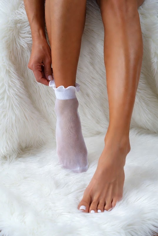 Next, the white nylon socks with those frilly ruffles—prissy as hell, rolling them up my ankles, the texture whispering against my tanned skin. Then the shiny silver Mary Janes, buckling them tight over my white-painted toes, making every step feel dainty and restricted. I glance down—bottom half all innocent and regressive, my perfect feet looking even cuter, screaming that secret about my pussy. Heat floods my face, but my thighs are slick now, rubbing together as I imagine Mistress noticing, maybe “punishing” me for getting wet without permission.